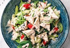 175 г • микс салатов, шпинат, томаты черри, сельдерей, сыр тофу, ореховый соус, микс кунжутов, миндаль