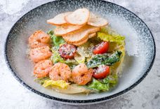 180 г • микс салатов, креветки, томаты черри, сыр пармезан, гренки, соус цезарь, сладкий соус чили