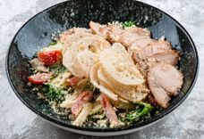195 г • микс салатов, пряная курица, томаты черри, сыр пармезан, гренки, соус цезарь