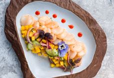 225 г • морской гребешок, манго, огурец, красный лук, сок лайма, оливковое масло, чили паста, кинза
