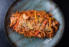 410 г • яичная лапша, яйцо, капуста, морковь, цукини, сладкий перец, куриное филе, кисло-сладкий соус, красный лук, арахис, кунжут
