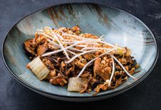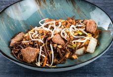 400 г • морковь, грибы шиитаке, яйцо, капуста микс, лук-порей, заправка для лапши, соус пад-тай, соус шрирача, арахис, говядина, ростки сои