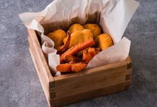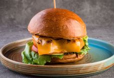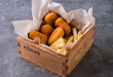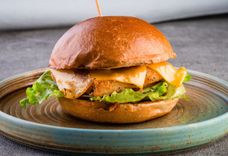 185 г • булочка Бриошь, куриные наггетсы, Чеддер, салат айсберг, огурцы, помидоры, сырный соус, кетчуп